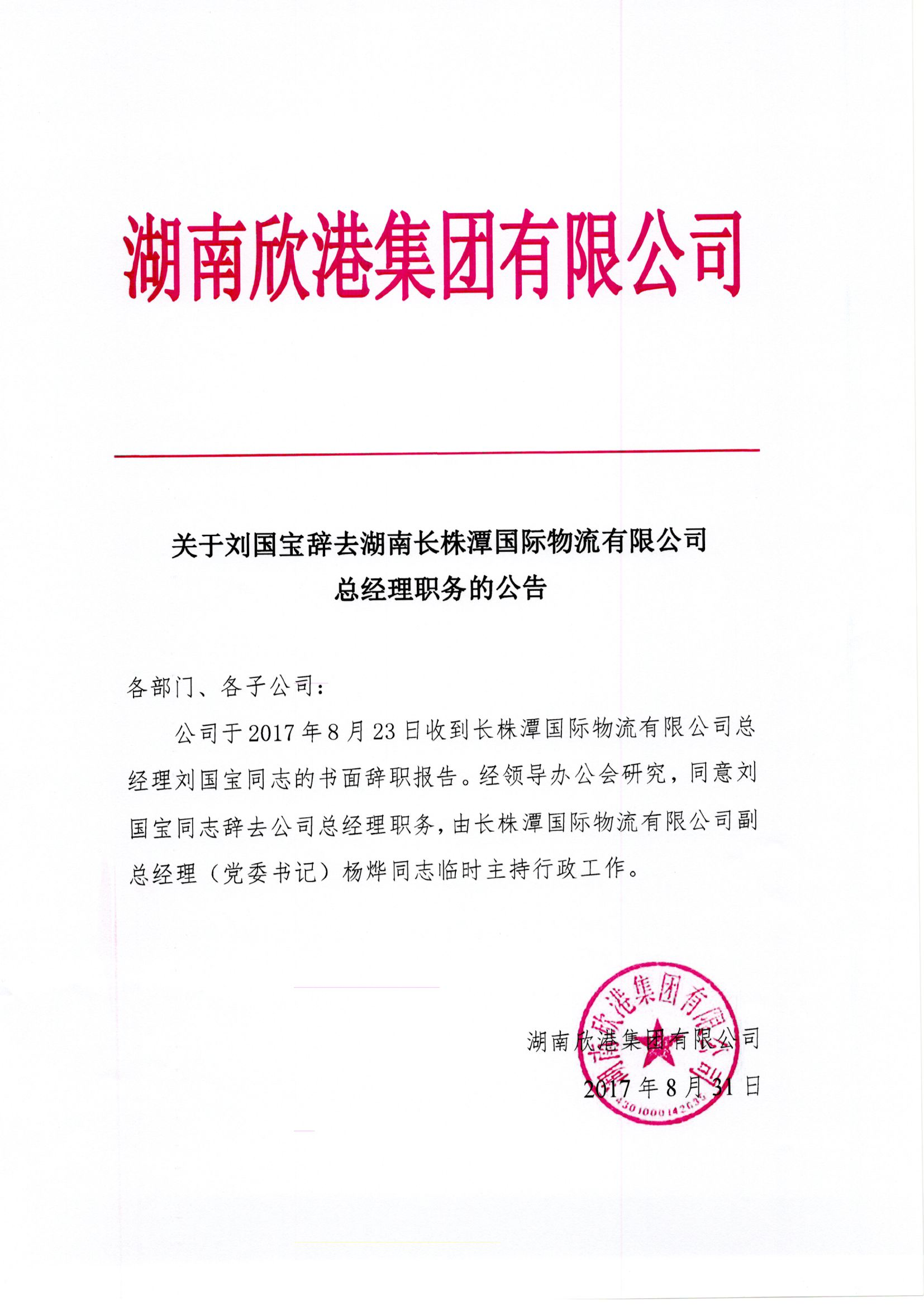 當前位置:首頁 > 資訊中心 > 關于劉國寶辭去湖南長株潭國際物流有限公司總經(jīng)理職務的公告